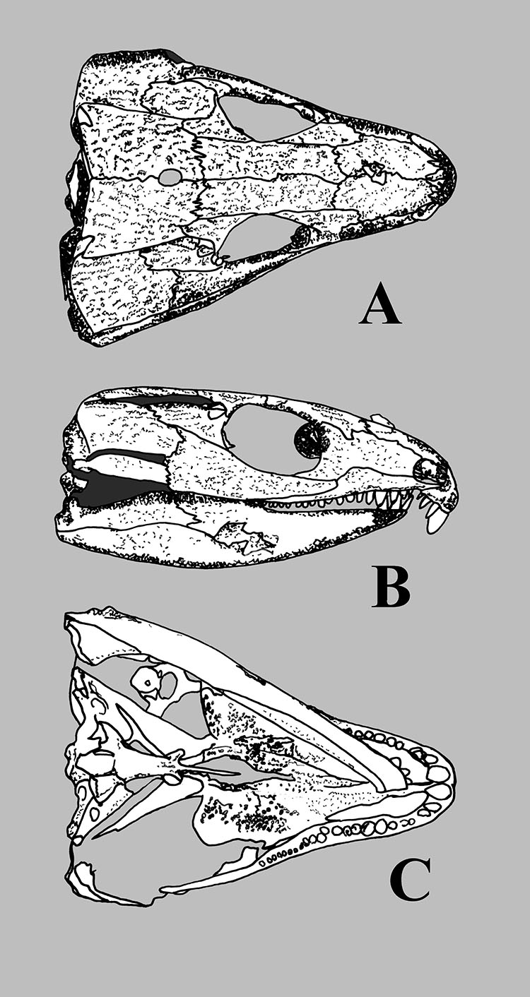 Captorhinus kierani OMNH &3281a skull after DeBRAGA, BEVITT & REISZ, 2019: A) dorsal; B) right lateral and C) venral views.