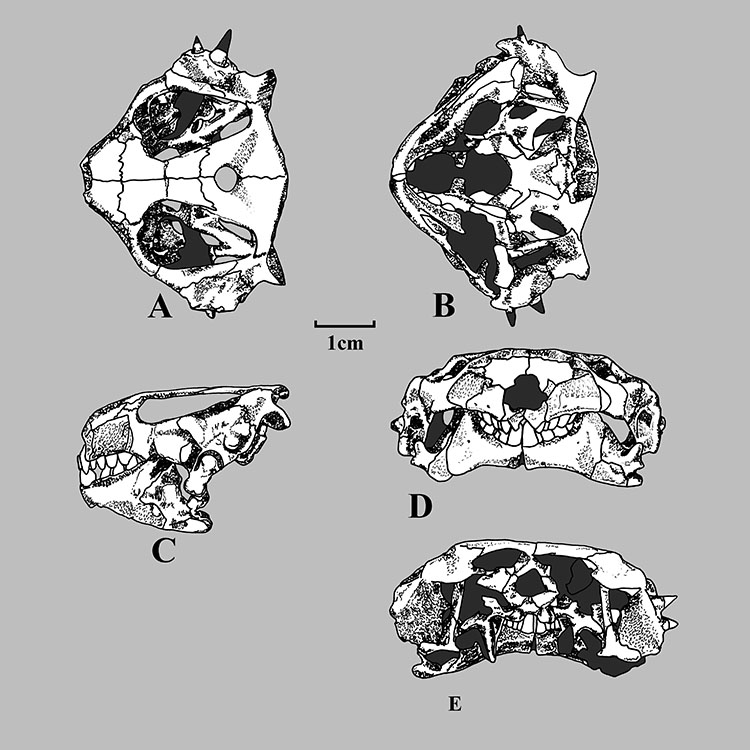 Hypsognathus fenneri NSM 998GF45.1 after SUES, OLSEN, SCOTT & SPENCER, 2000: A) dorsal; B) ventral; C) left lateral; D) anterior and E) posterior views.