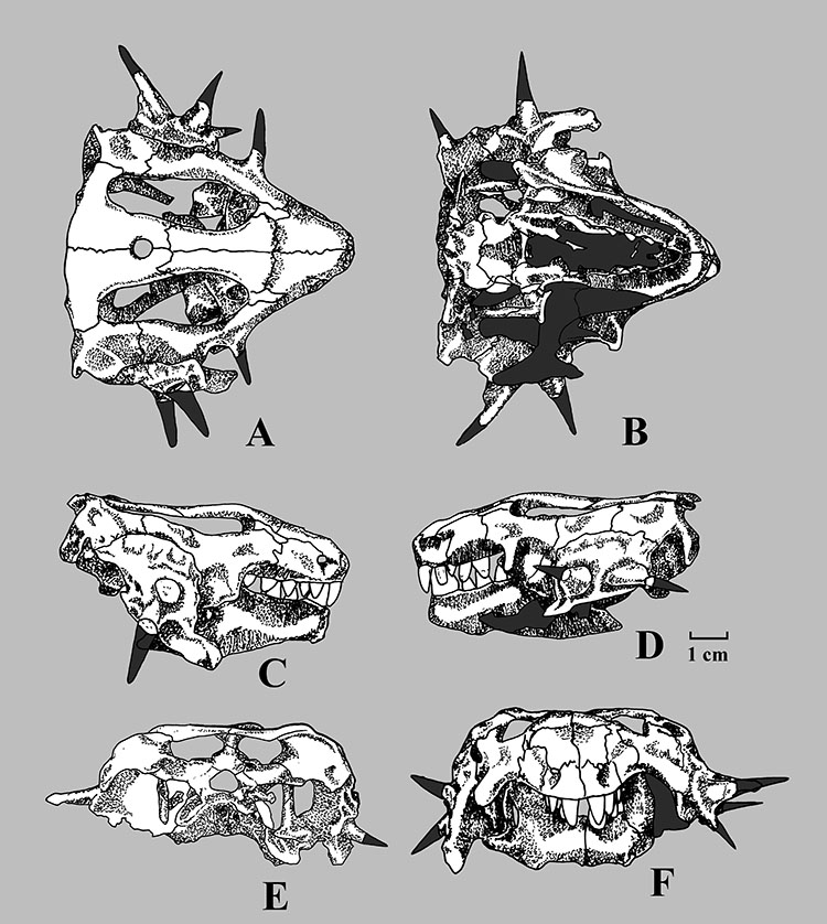 Hypsognathus fenneri YPM 55831 after SUES, OLSEN, SCOTT & SPENCER, 2000: A) dorsal; B) ventral; C) right lateral; D) left lateral; E) posterior and F) anterior views.