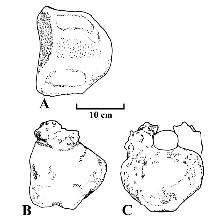 Nebraska State Museum No. 6-8-28, Distal end of right femur after BARBOUR, 1931: A) lateral; B) posterior; and C) ventral views.