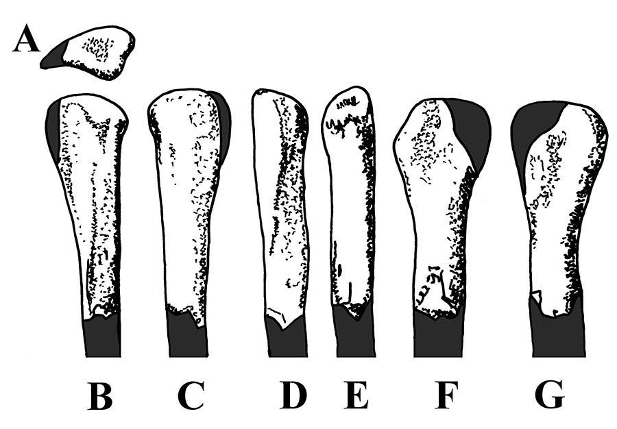 Compsognathid gen. sp indet after BUFFETAUT & INGAVAT, 1984; A-E TF 1739-1 left tibia; A) porximal articular surface, B) lateral view, C) Medial view; D) anterior view, E) posterior view: F, G TF 1739-2, right humerus; F) medial and F) lateral views.