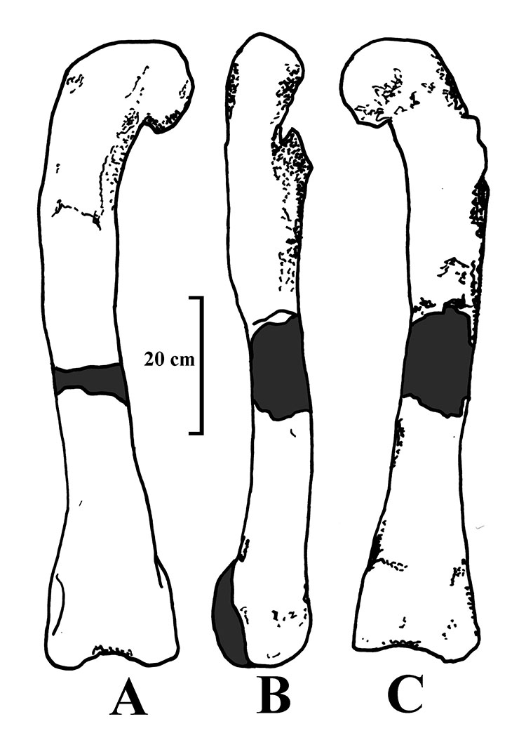 Gray Natural History Museum (Haute-Saone, eastern France), Left femur: A) caudal, B) meidal and C) cranial view.