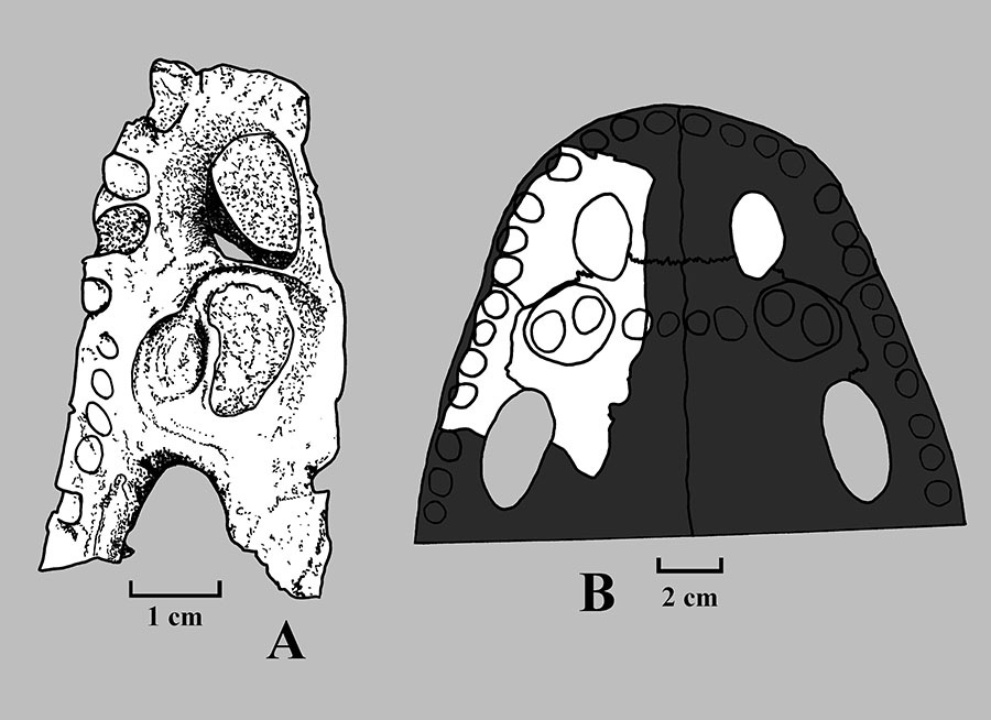 Negevodus ramonensis Holotype: HUJ TR 2000 after ZANON, 1991: A) venral view; B) position of the skull elements.