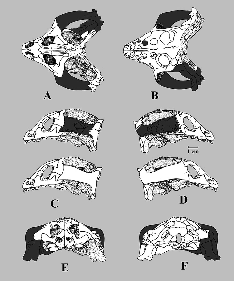 Cyamodus rostratus Holotype skull UMOP BT 748 after KUHN-SCHNYDER, 1965: A) dorsal; B) ventral; C) left side view; D) rigth side view; E) anterior and F) posterior views.