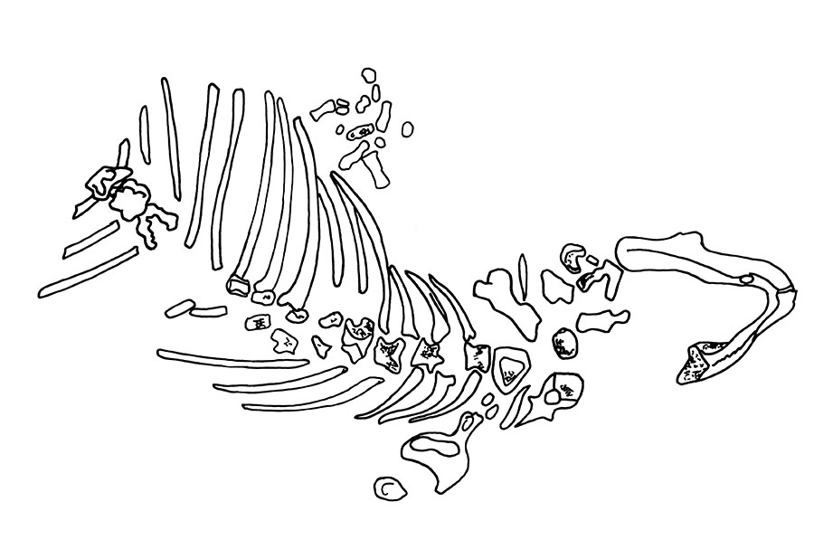 AMNH 1676: A partial skeleton, containing the following elements, skull and mandible, 21 presacral vertebrae, 20 of these in a series, 12 left ribs, 15 right ribs, right scapula, humerus, radius, and ulna, manus, part of left manus and some isolated carpals.