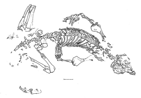 A) Dorsal view of cervical vertebrae; B, C) Crus and feet. (After Carroll,