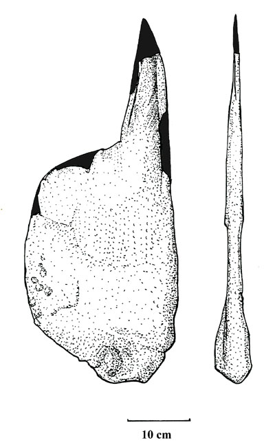 SMC J.46875: Distal end of right pubis described by HUENE 1901, as an ornithopod ischium.