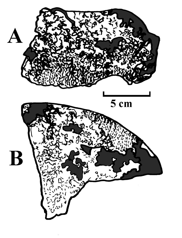 DMNH 32649: Portion of skull cap after CARPENTER & YOUNG, 2002: A) dorsal and B) lateral views.