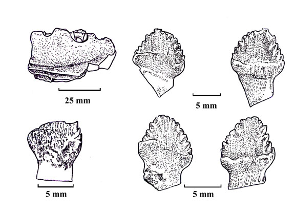 Material: A partial lower jaw with a tooth in situ, 2 isolated teeth, a cervical vertebra and a latex cast prepared from a natural mould of three articulated cervical vertebrae, two dorsal centra from the presacral rod, parts of the ?sacrum, three fragmentary caudal vertebrae, rib fragments, a fragmentary scapula, a fragment of ilium, four metapodials and two phalanges, a collection of dermal elements, representing five different kinds of armor.