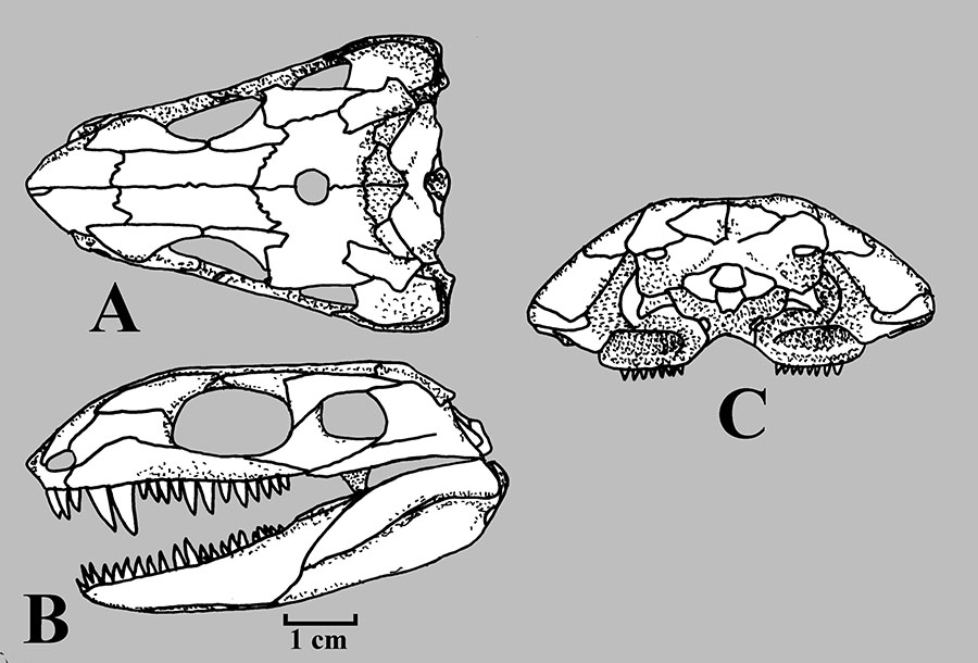 Eothyris parkeyi Holotype: MCZ 1161 reconstruction after REISZ, GODFREY & SCOTT, 2009: A) dorsal; B) right lateral and C) posterior views.