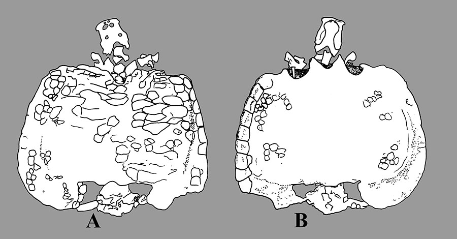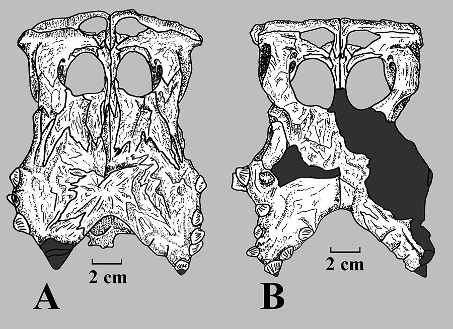 Henodus chelyops skulls after RIEPPEL, 2001; A) Specimen IV, BPIT uncatalogued: B) Specimen 1 of Huene, 1936.