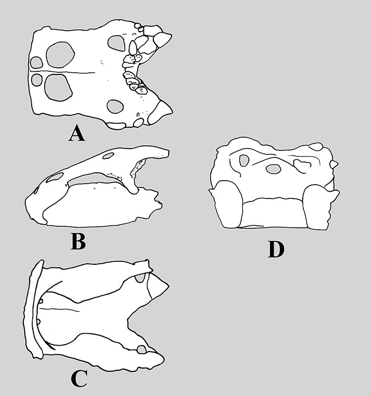 HUENE, 1958, Examplar III, skull; A) dorsal; B) left lateral; C) ventral and D) posterior views.