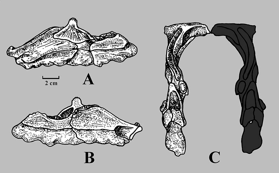 Henodus chelyops jaws after RIEPPEL, 2001 based mainly on specimens I and II of HUENE, 1936: A) left lateral; B) medial and C) dorsal views.
