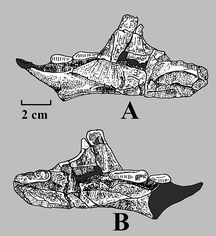 Placochelys placodontia Holotype: FAFI Ob/2323/Vt.3 jaw after RIEPPL, 2001: A) left lateral; B) medial veiws.