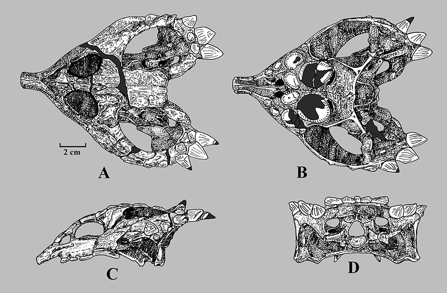Material: Skull and dentary missing distal end of tip, fragmentary skeleton and dermal shield.