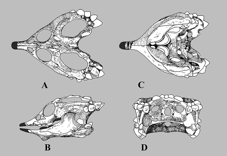 Placochelys placodontia Holotype: FAFI Ob/2323/Vt.3 skull after JAEKEL, 1906: A) dorsal; B) left lateral; C) ventral and D) posterior views.