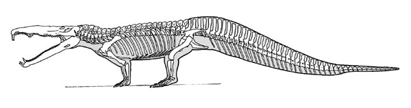 Composite skeleton (after Long & Murry, 1995). Skull based on Smilosuchus gregorii; vertebral column to anterior caudals of Leptosuchus adamanensis (based on holotypes of Machaeroprosopus adamanensis and M. zunii); girdles based on holotype of Machaeroprosopus adamanensis; mid- and distal portion of tail based largely on the Pseudopalatinae; appendicular elements based on variety of Leptosuchus and pseudopalatine specimens; dermal armor and presacral ribs based on Leptosuchus adamanensis (holotypes of M. zunii and M. adamanensis). Neural spines on caudal vertebrae should probably be inclined more posteriorly an dmanus should probably be reduced in size relative to the pes.