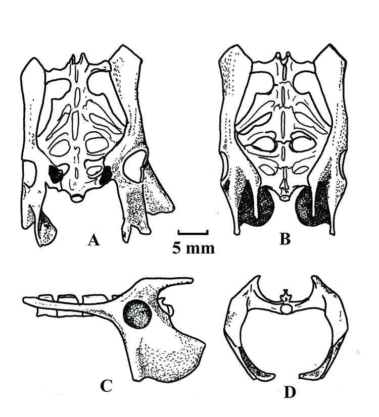 Campylognathoides sp, after Wellnhofer, (1986); A) ventral; B) dorsal; C) right lateral; D) posterior view.