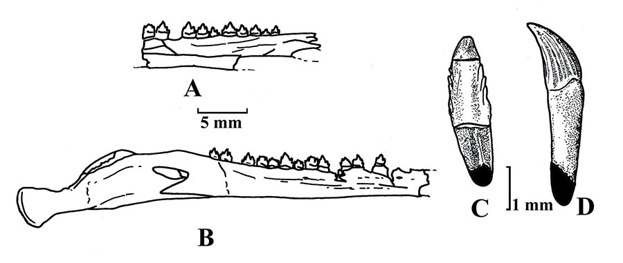 Eudimorphodon cf. ranzii after Wellnhofer, (2001, 2003), BSP 1994I 51’ A) right mandible; B) left mandible; C) pseudo-unicupsid (?mandibular) tooth and D) ?rostral premaxillary tooth.