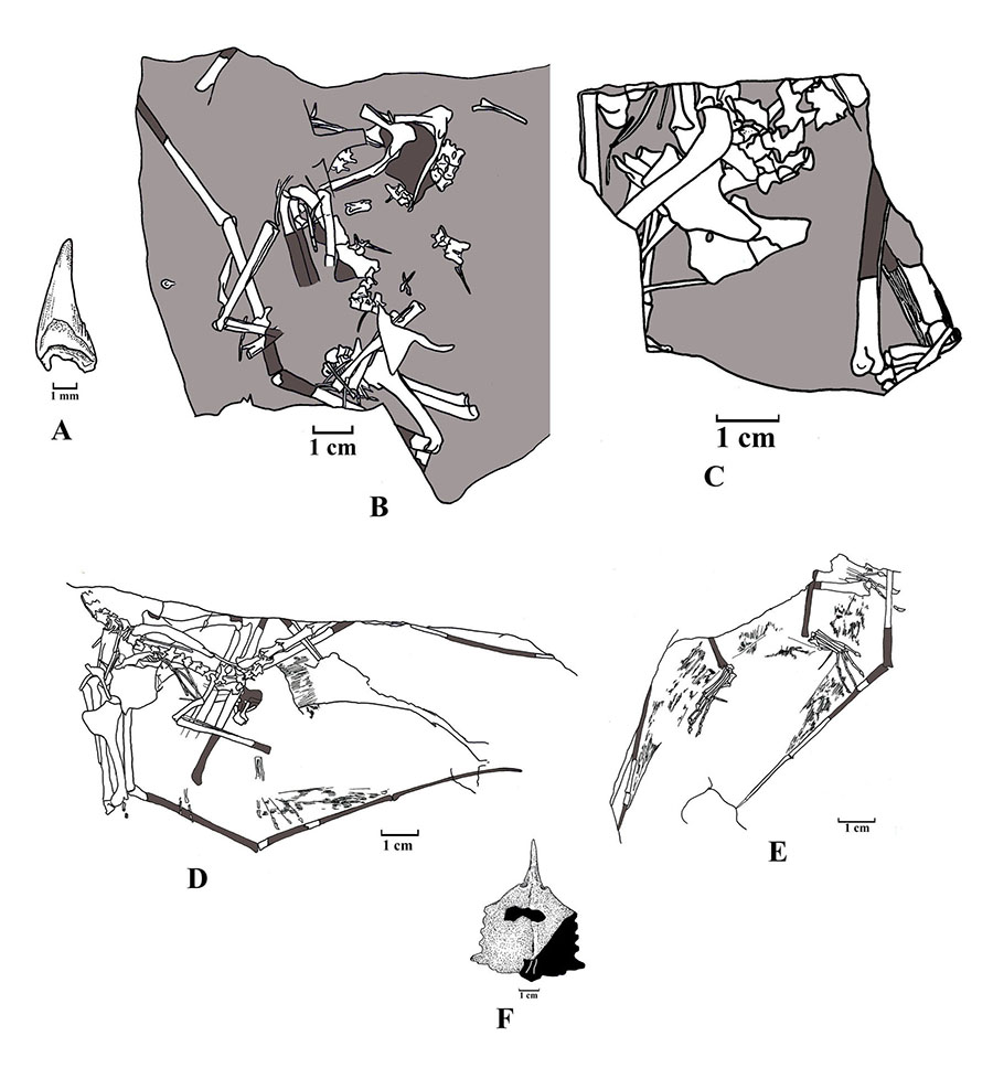 Eudimorphodon ranzii referred specimens; A) MCSNB 3345 2887, tooth (after Wild, 1978); B) MCSNB 2887 fragmentary specimen, (after Wild, 1978); C) MCSNB 3496 fragmentary specimen (after Wild, 1978); D) MCSNB 8950 A fragmentary specimen (after Wild, 1993); E) MCSNB 8950 B (after Wild, 1993); and F) MPUM 7039 sternum, after Renesto, (1993).