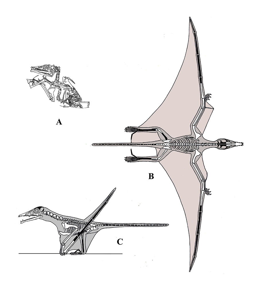Eudimorphodon ranzii Holotype: MCSNB N. 2888; A) after Wild (1978); B. C) new reconstruction; B) dorsal, and C) lateral views.