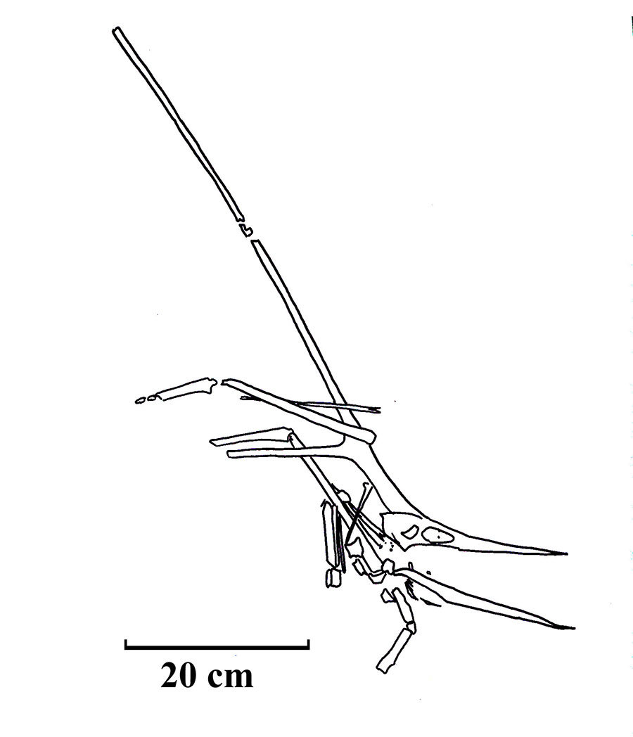 Private Collection (Mr. Kenneth Jenkins), KJ1: Skull and cranial crest, possible fragmentary sclerotic ring elements, mandible, atlas’axis complex and four mid-cervical vertebrae, the right humerus, radius, ulna, distal syncarpal, and pteroid, the right and left wing metacarpals, and the incomplete right and left first wing phalanx, a nuber of ossified tendons preserved adjacent ot the antebrachium and metacarpus. This specimen does not preserve any trace of proatlas, proximal syncarpals, preaxial carpals, or metacarpals and phalanges of manual digits I-III, and all preserved on a single slab of chalk.