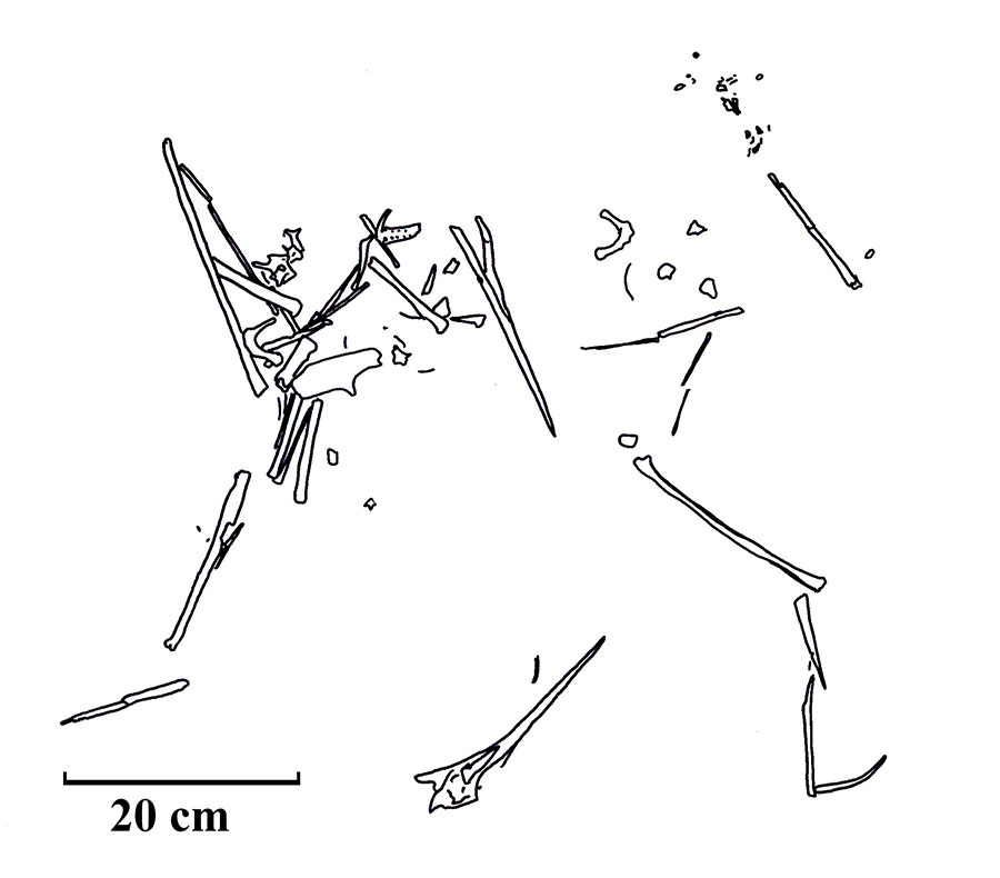 KJ2: Skull, five fragments of the cranial crest, mandible, five mid-cervical vertebrae, notarium with fused dorsal ribs, three free dorsal vertebrae, free dorsal ribs, pelvis, prepubis, both scapulocoracoids, the humeus, radius, ulna, proximal and distal syncaprals, pteroid, Mc IV, and incomplete WP 1 of the left wing, the ulna, distal syncarpal, pteroid, incomplete Mc IV, and compelte WP 1-3 fo the right wing, both femora, and both tibiae, several sections of ossified tendons, all on a single slab of chalk. It is missing proatlas, sternum, caudal vertebrae, preaxial carpals, metacarpals and phalanges of manuyal digits I-III, tarsals, or pedial digits. Note: Possible hesperornitiform elements found as float on the slab; one vertebra and wing elements.