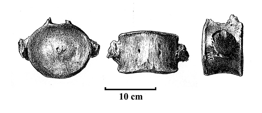 Material: 1 tooth, 36 vertebral centra, both femora incomplete, fragments